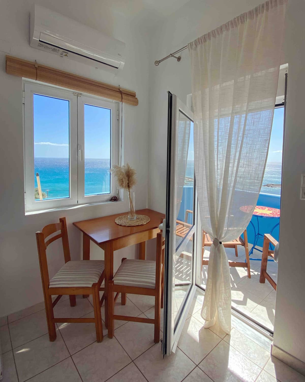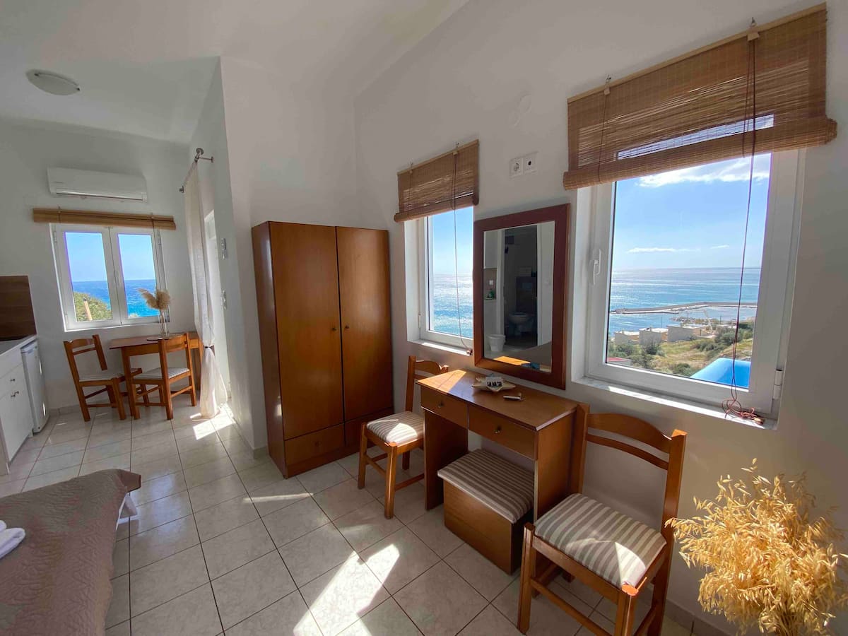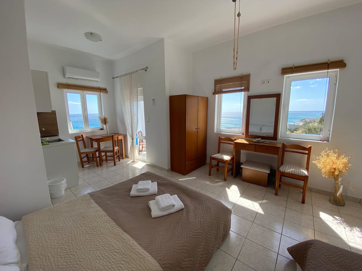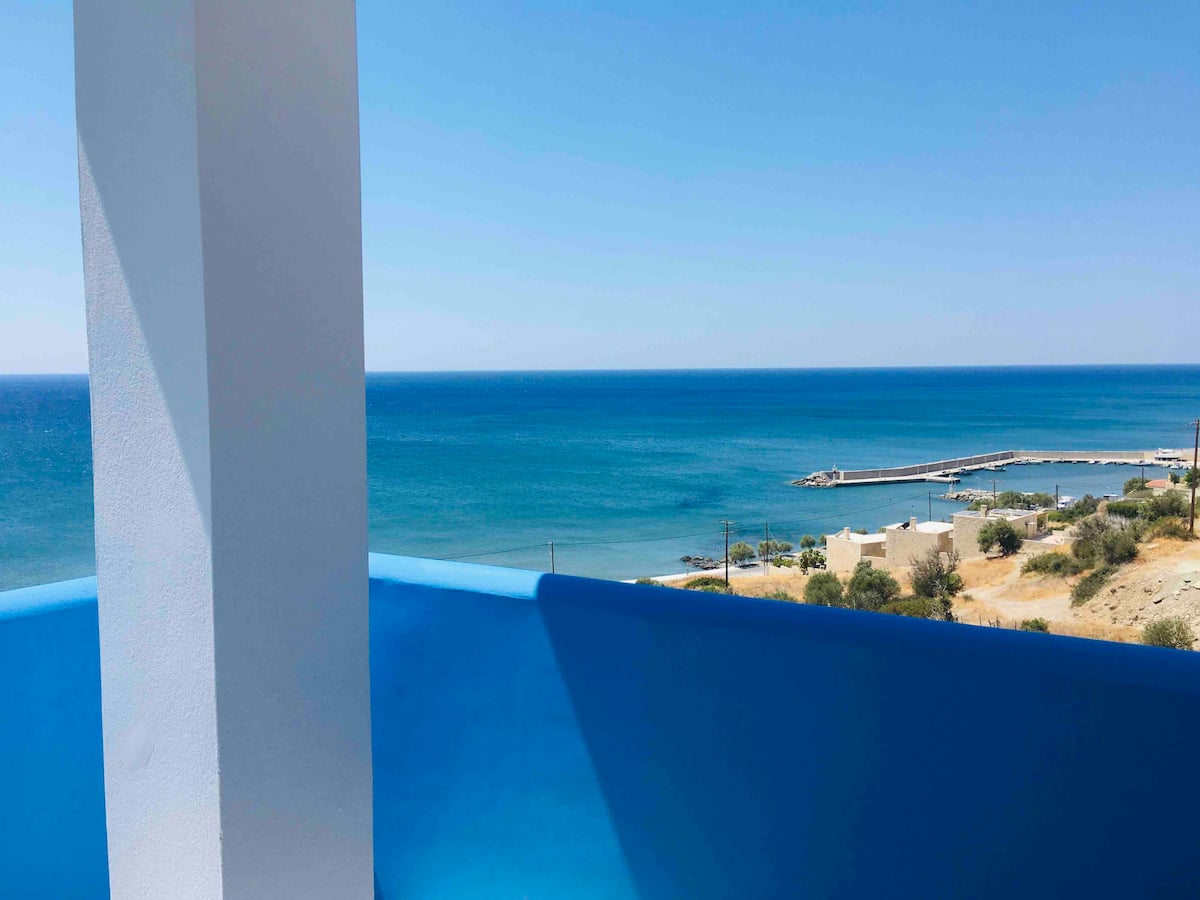 Our rooms are located in the center of the village of Kastri. From the balcony, you can enjoy a wonderful view of the southern Cretan Sea. The natural beaches, traditional Cretan tavernas, cafés, and mini markets are all within walking distance in just a few minutes.