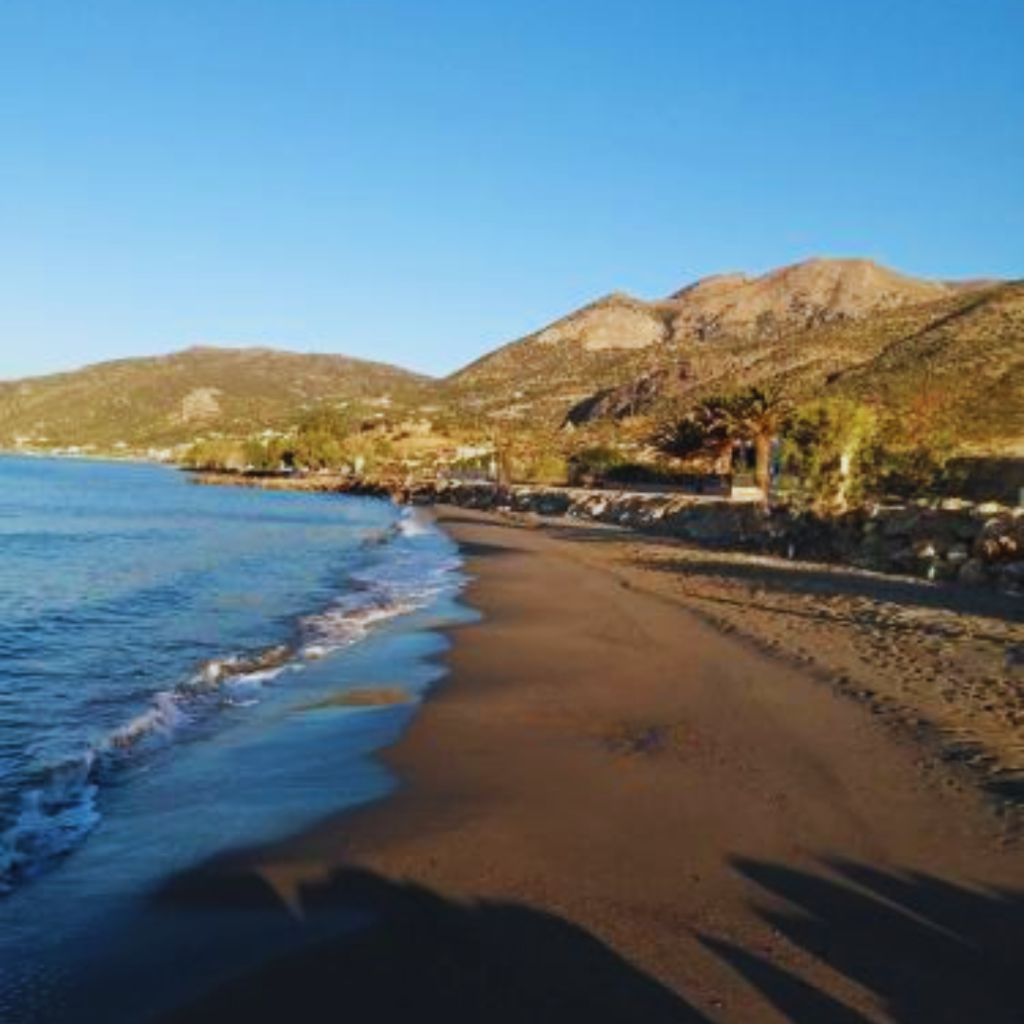The main beach of Keratokambos stretches east of the small village harbor, extending to the mouth of the Keratokambos river, which collects waters from the Portelas Gorge and the Kavousi Gorge. The western part of the beach, near the village, is sandy and quite organized, while as you head east, the area becomes quieter and more secluded, ideal for those seeking peace and tranquility.