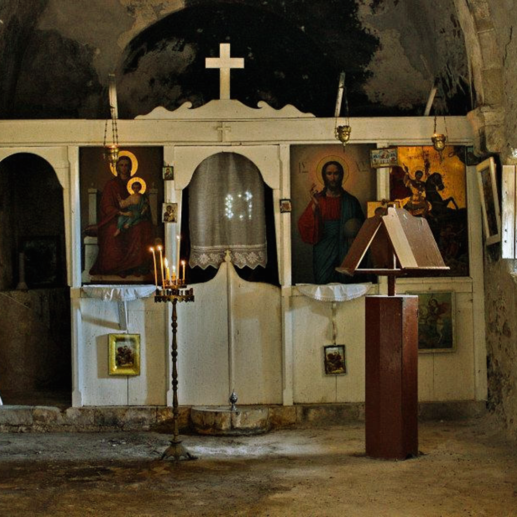 Though the monastery's cells and accompanying structures have fallen into ruins over the years, the Church of Saint Demetrios remains a stunning example of Cretan ecclesiastical architecture. Its single-aisled design is accentuated by a barrel-vaulted roof that evokes a sense of grandeur and serenity. As you step inside, you are greeted by the soft glow of light filtering through the windows, illuminating the beautifully preserved frescoes that adorn the walls. These intricate artworks depict various saints and biblical scenes, captivating the imagination of all who enter.