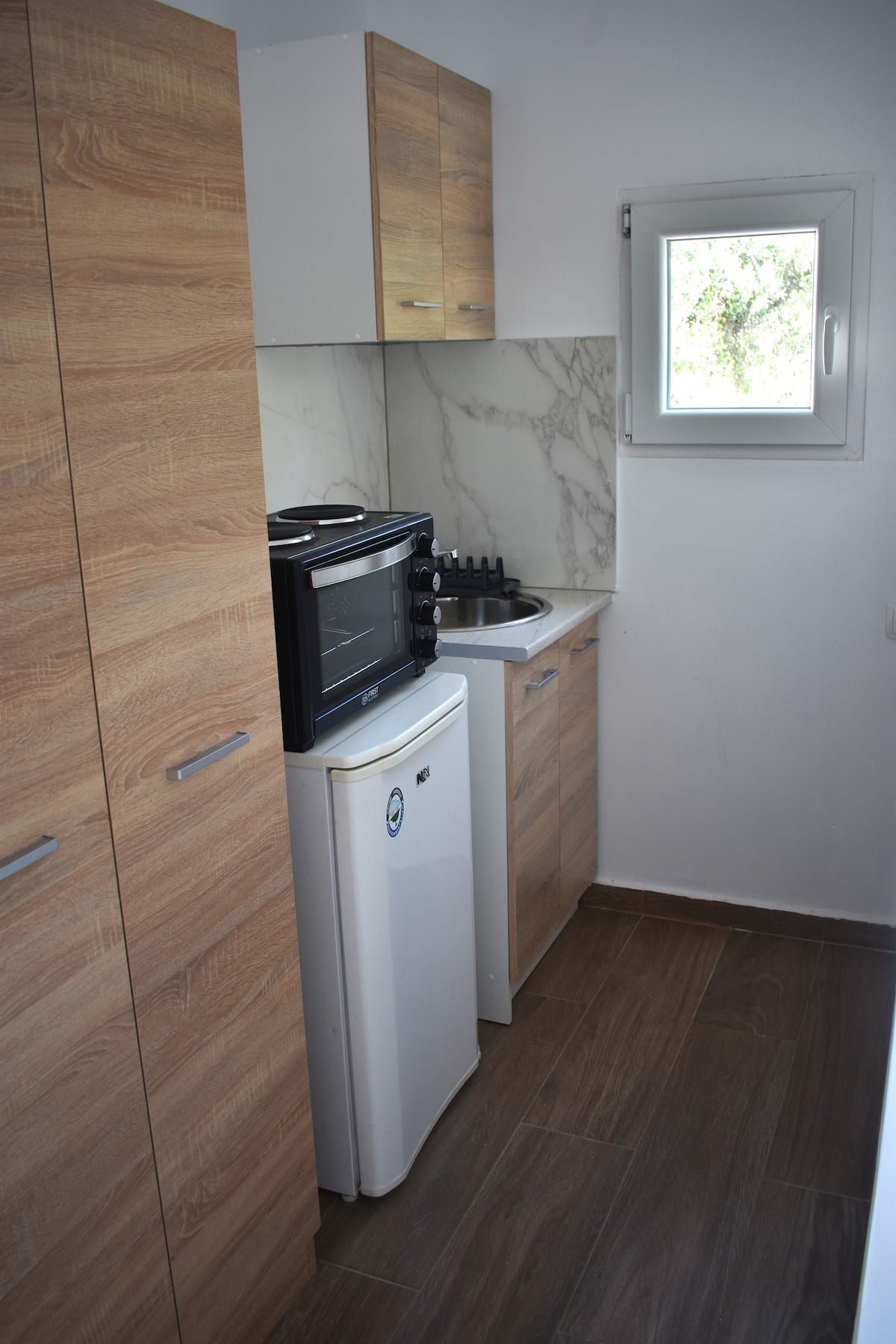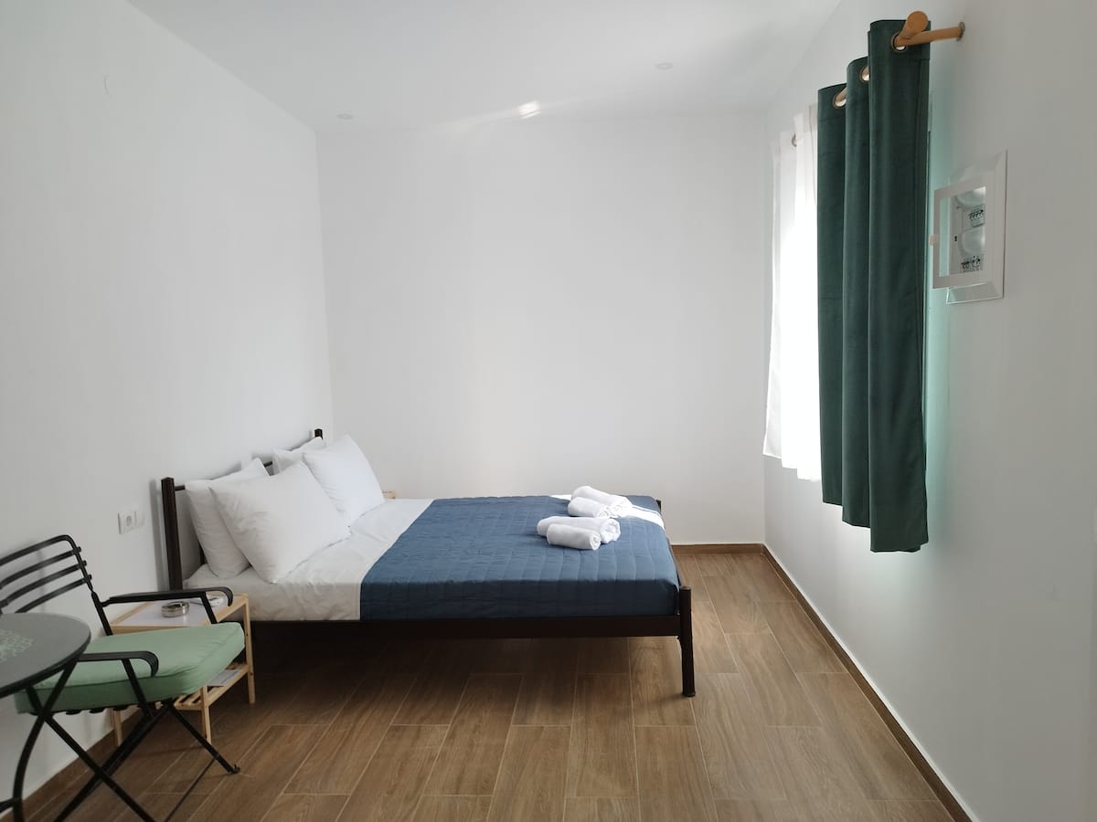 Έχει διπλό κρεβάτι, μικρή κουζίνα, μπάνιο και δικό του κήπο.
